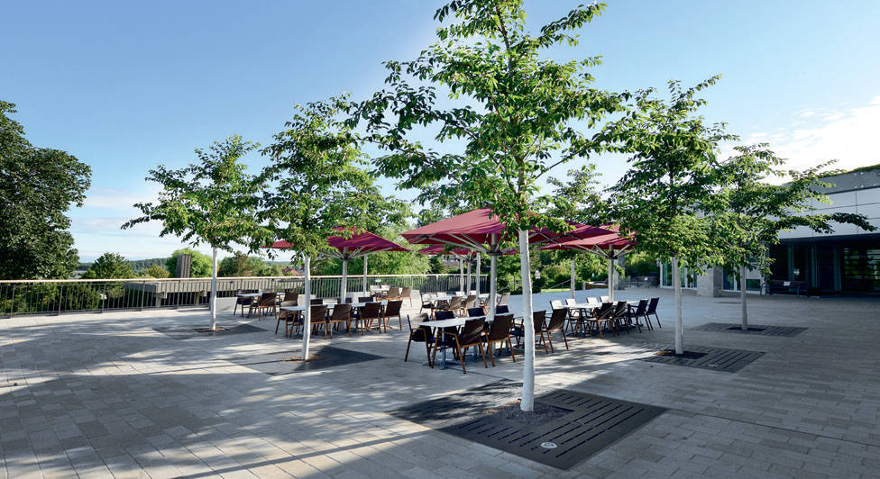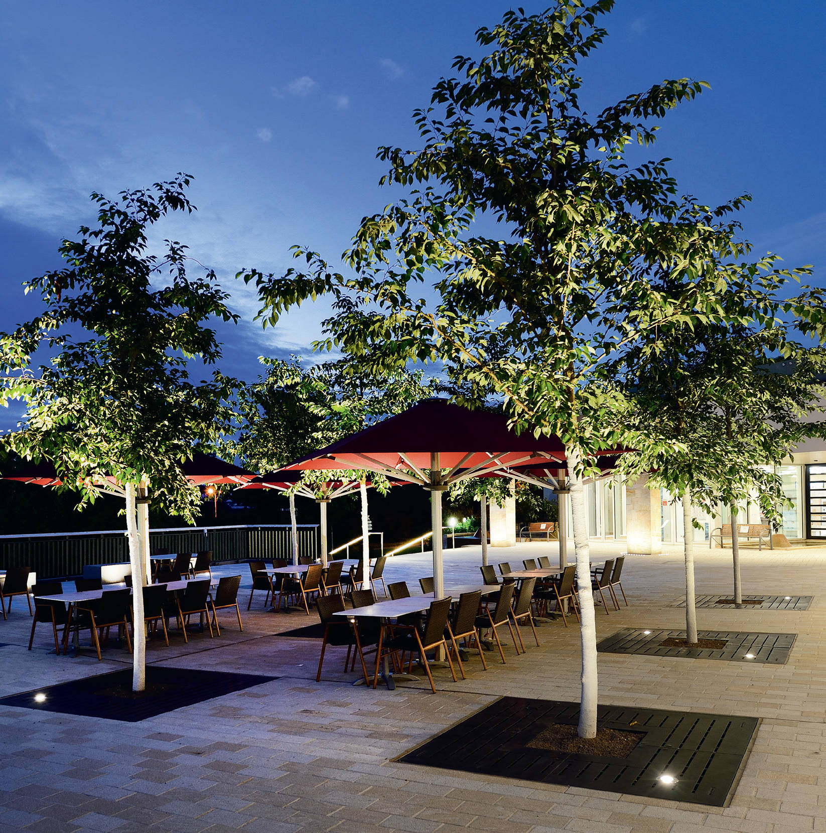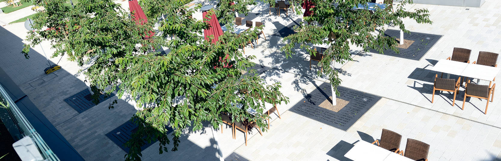 Bei der Neugestaltung des Vorplatzes der Panoramatherme wurde als Kontrast zum hellen Natursteinbelag der moderne LATERAL® 2.0 Baumrost gewählt. Durch die Abdeckung der Baumscheiben mit den Guss-Baumrosten kann die Bestuhlung bis nahe an den Baumstamm herangeführt werden, wobei der Schutz vor Verdichtung der Pflanzgrube gewährleistet bleibt. Die Fläche kann somit optimal ausgenutzt werden und die Bäume bieten einen Schattenplatz beim sommerlichen Verweilen. Dank der Multifunktionsöffnung in den Baumrosten wurden je Baumrost ein oder zwei Dot-spot® LED-Strahler integriert, um auch am Abend eine schöne Stimmung zu schaffen.