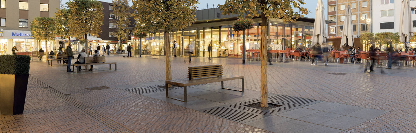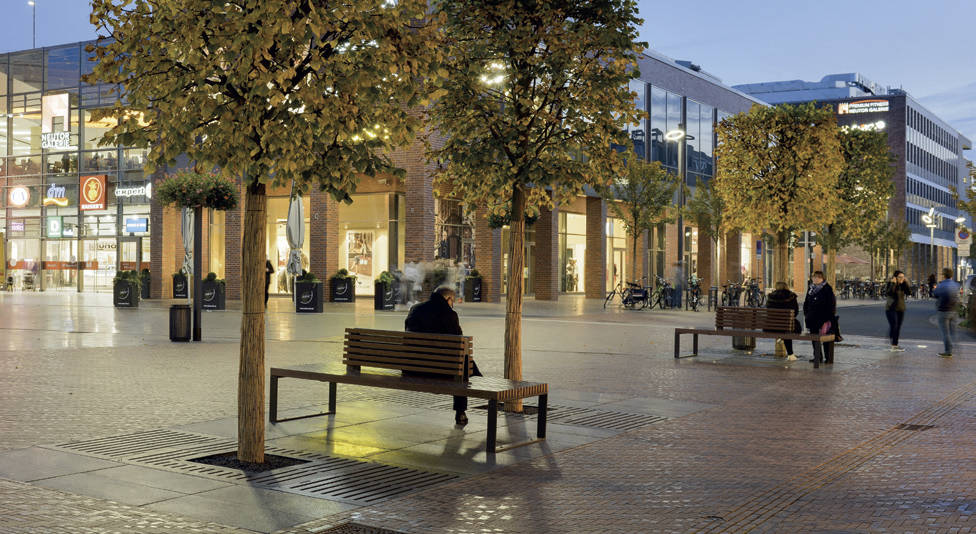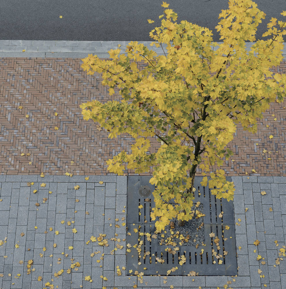 Die Baumroste sollten unter Berücksichtigung der Wurzelballengröße von Ø 1.200 mm an das Raster der Pflasterfläche angepasst werden. Mit Baumrosten im Lineardesign der Serie LATERAL® erfolgte eine optimale Umsetzung.