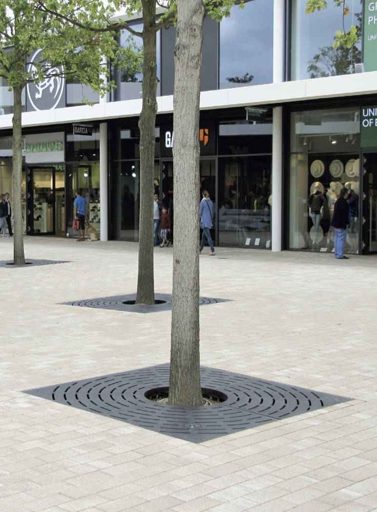 Das Radialdesign der RONDELLO® 2.0 Baumroste gleicht sich gestalterisch an die oval-runden Gebäudeformen an. Die quadratischen Außenabmessungen bilden einen Kontrast dazu und erlauben eine optimale Einbindung in die Pflasterfläche.