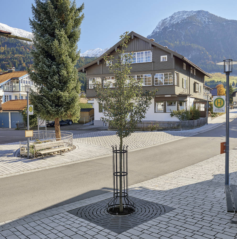 Im Zuge der Neugestaltung des Ortszentrums wurden an die Baumscheibenabdeckungen besondere Anforderungen gestellt, da sich die Baumstandorte neben der Fahrbahn befinden und auch die Parksituation verbessert werden sollte.
