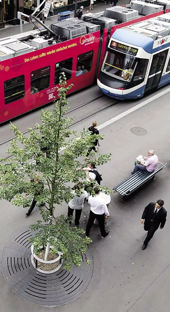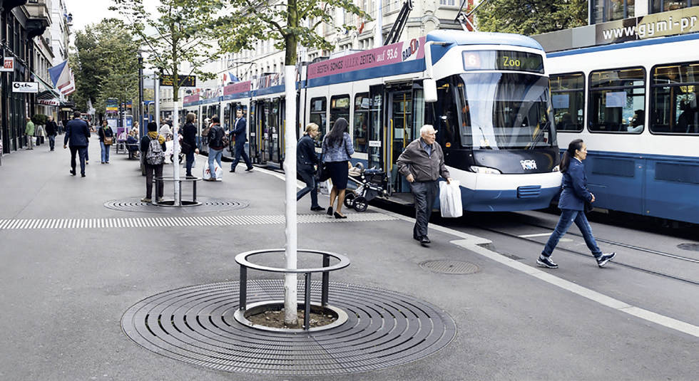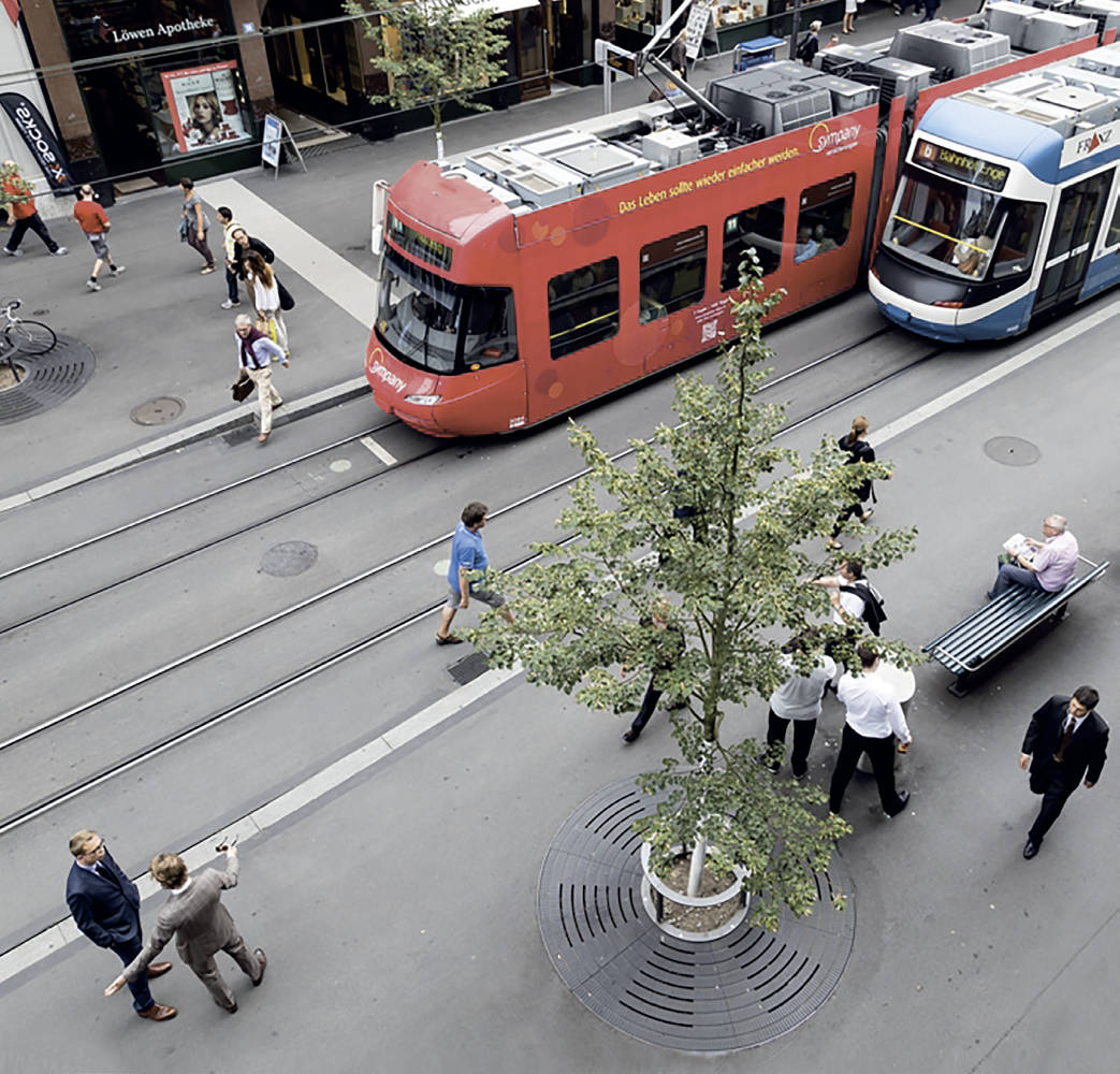 - Baumroste „Modell Zürich-Bahnhofstraße“ (Baumrost nach gestalterischen Vorgaben der Stadt Zürich) inklusive Anfahrschutz Typ TMH Hagenbucher